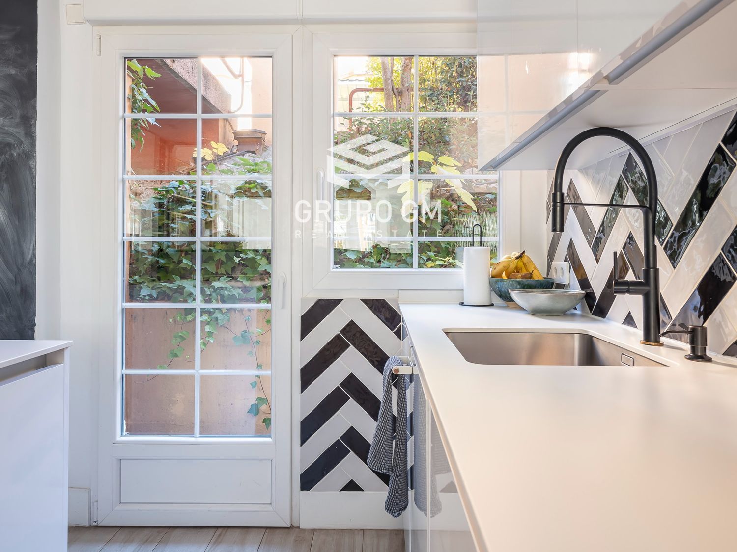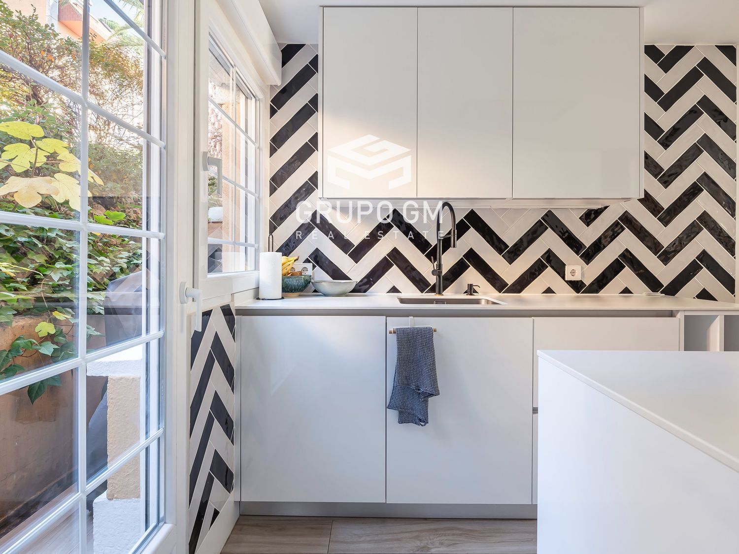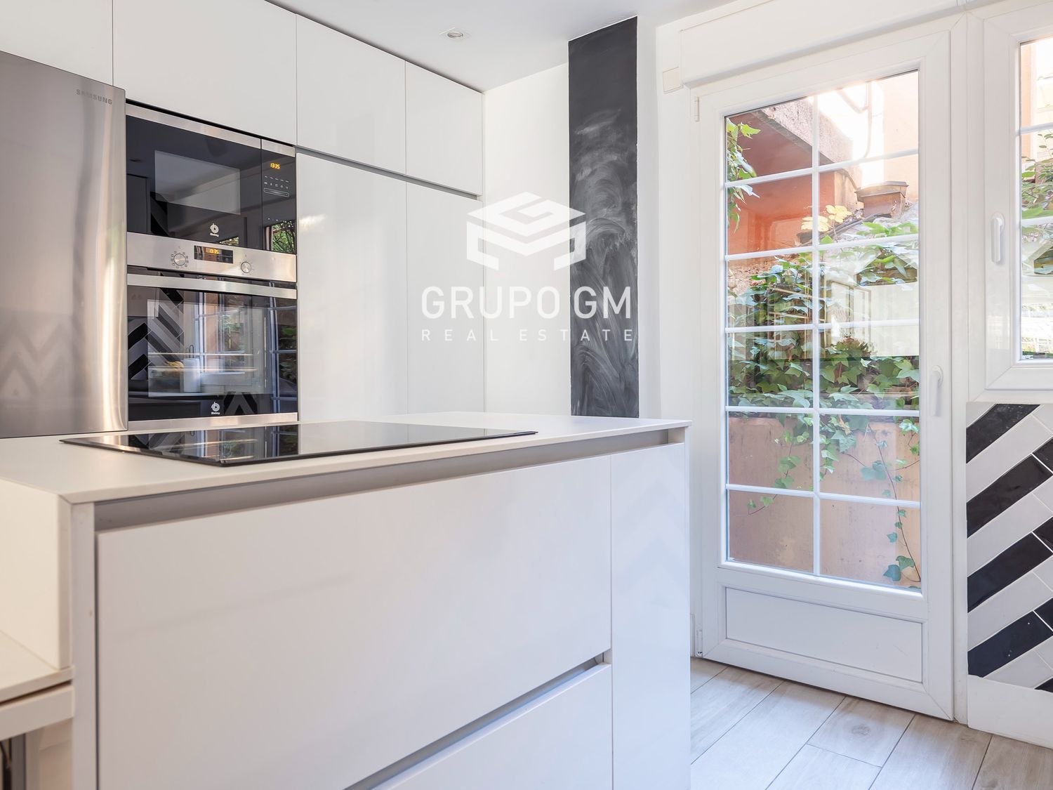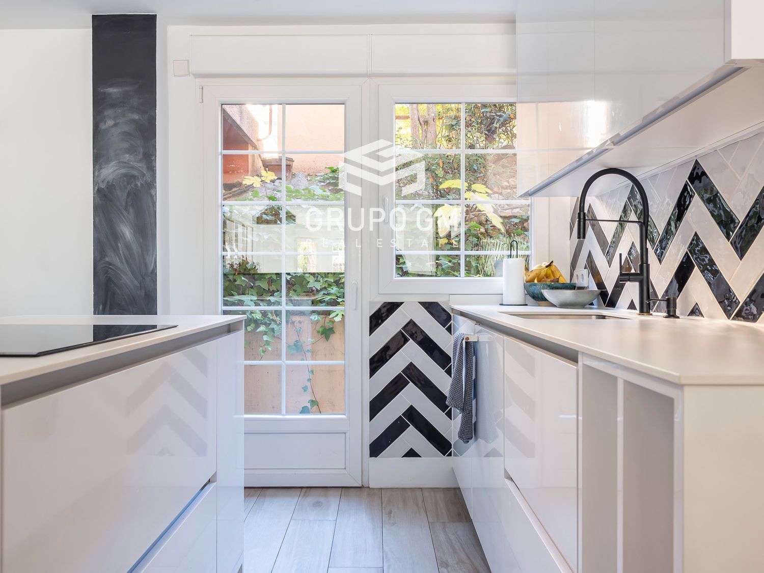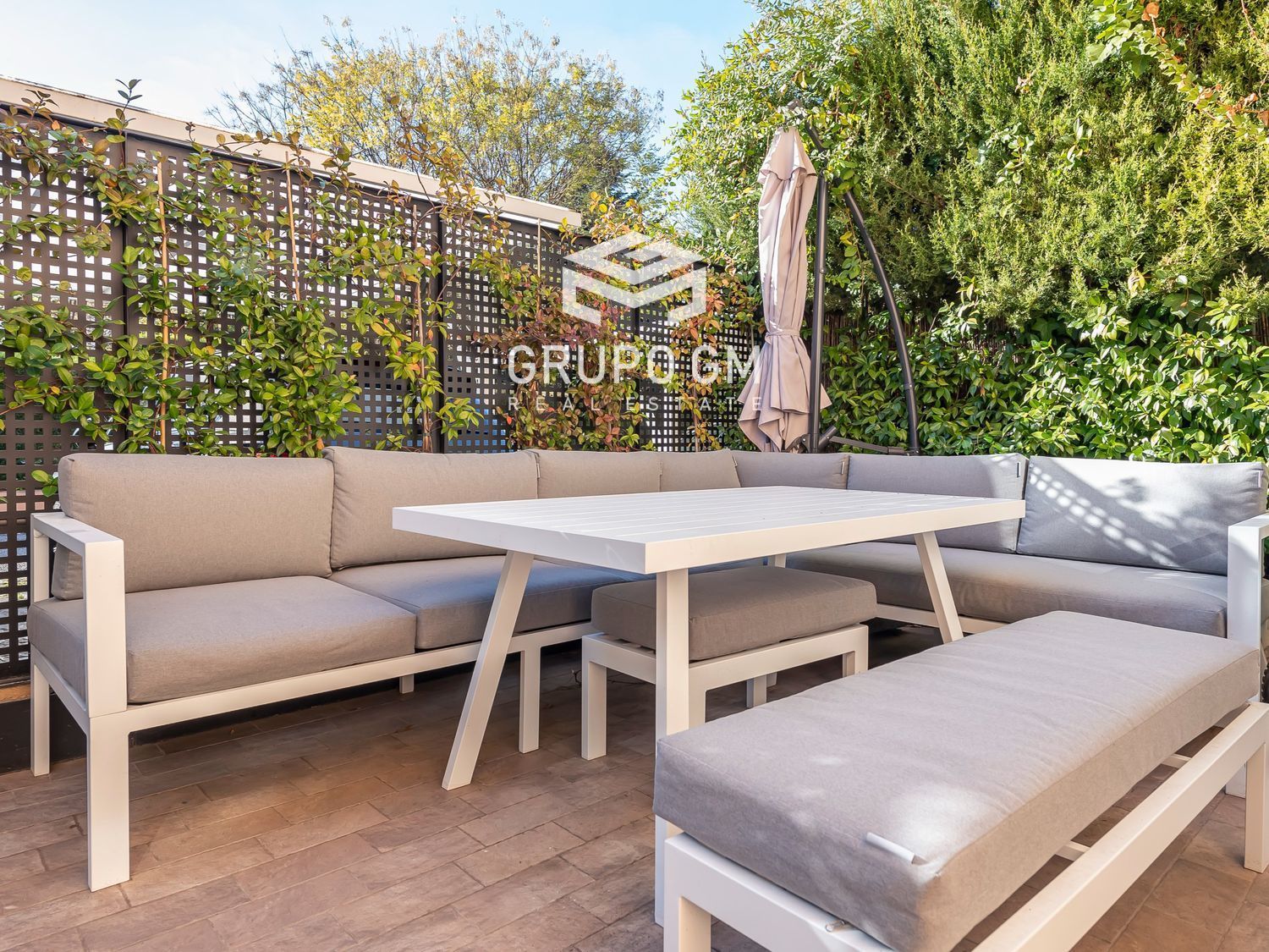 La planta principal incluye salón-comedor con gran entrada de luz natural, cocina independiente conectada visualmente mediante ventanal, habitación de servicio, baño completo y terraza. En el exterior, jardín solado de aproximadamente 25 m².