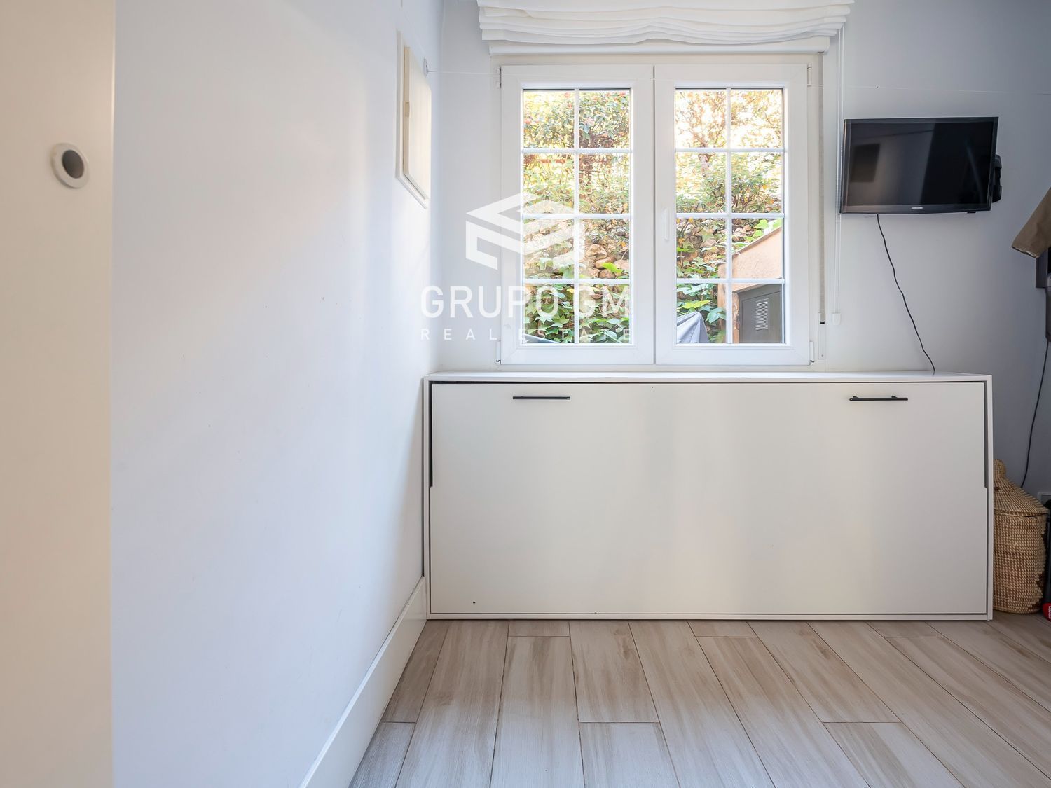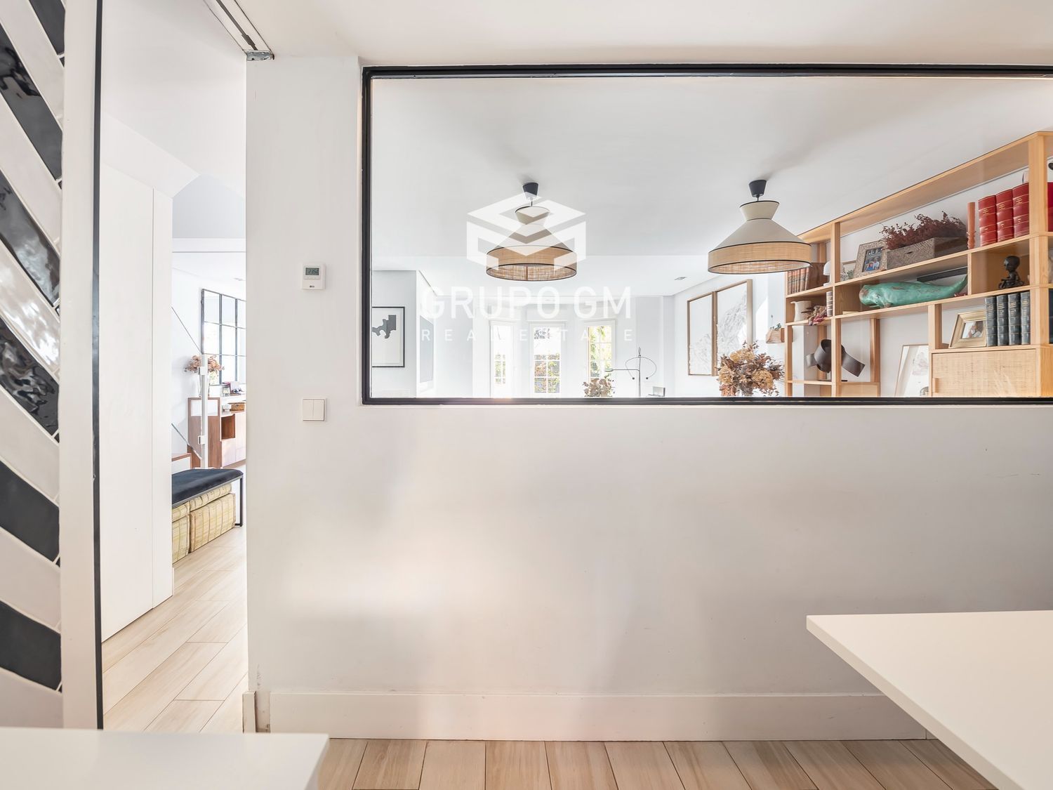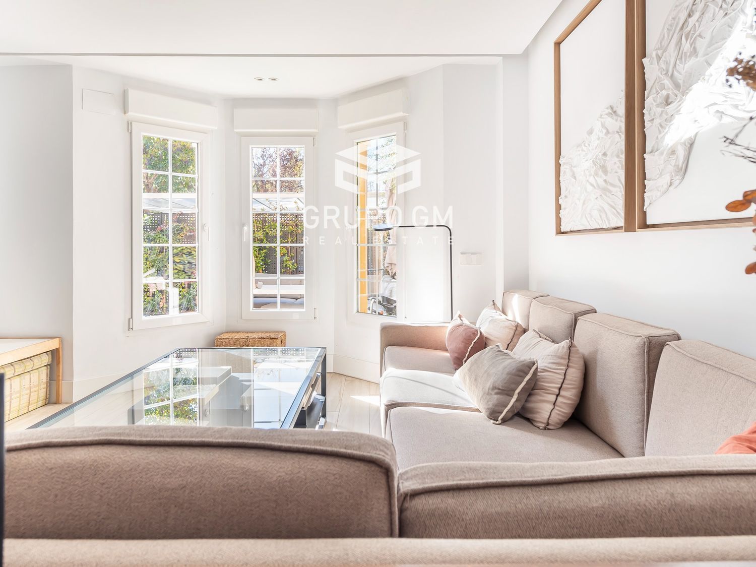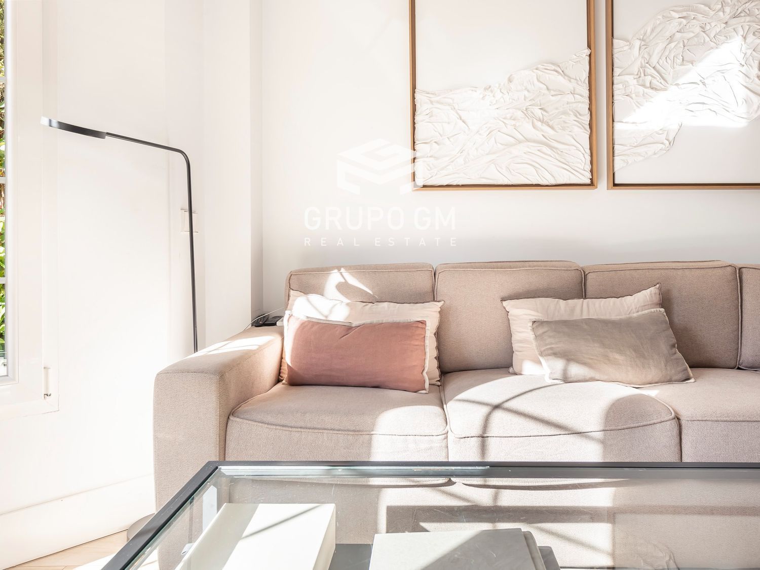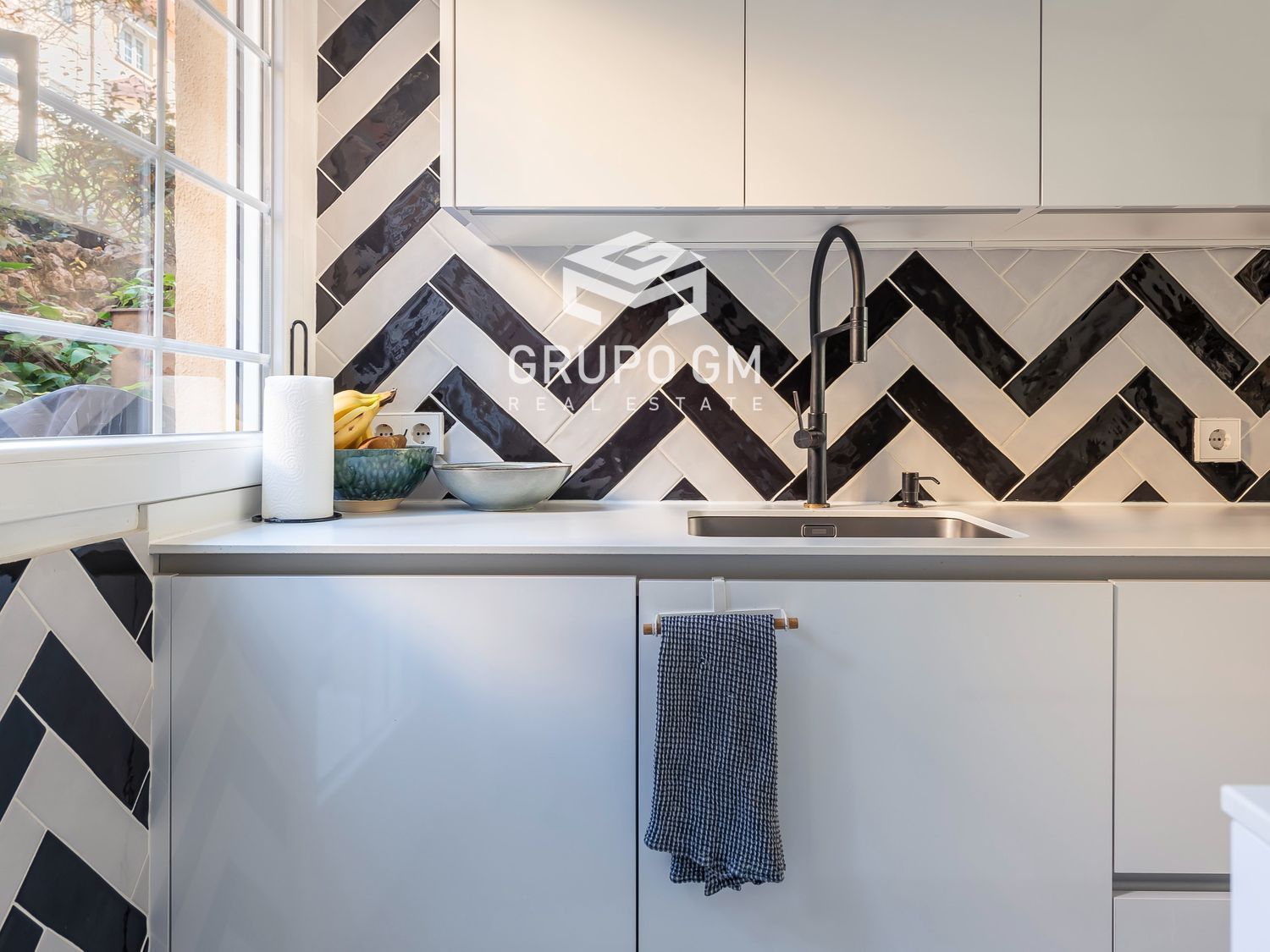 La planta principal incluye salón-comedor con gran entrada de luz natural, cocina independiente conectada visualmente mediante ventanal, habitación de servicio, baño completo y terraza. En el exterior, jardín solado de aproximadamente 25 m².