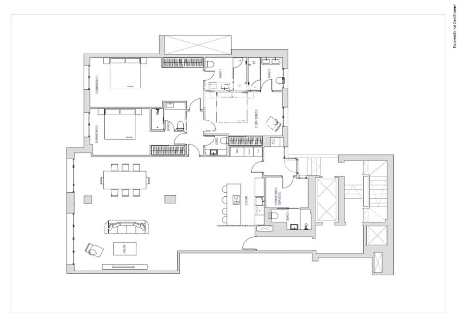 El piso cuenta con 3 dormitorios, todos en suite, lo que garantiza privacidad y confort. Además, hay un dormitorio adicional de servicio con baño incorporado, ideal para visitas o como espacio de trabajo. La distribución sin muros de carga permite una gran flexibilidad en el diseño interior, mientras que los armarios empotrados ofrecen un amplio espacio de almacenamiento.